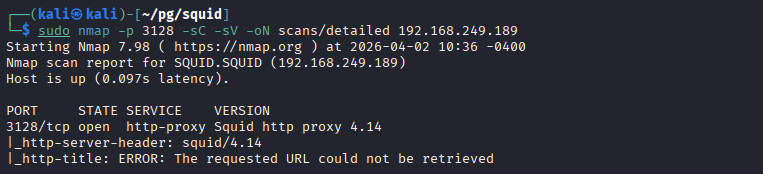 └─$ sudo nmap -p 3128 -sC -sV -oN scans/detailed 192.168.249.189
