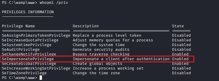 SeImpersonatePrivilege Impersonate a client after authentication Enabled